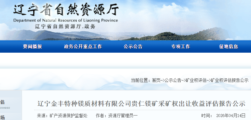 遼寧金豐特種鎂質(zhì)材料有限公司貴仁鎂礦采礦權(quán)出讓收益評估報告通過遼寧省自然資源廳門戶網(wǎng)站向社會公示,公示10個工作日。如有異議,請于公示之日起10個工作日內(nèi)以電話方式先向省自然資源廳礦產(chǎn)資源保護監(jiān)督處提出簡要意見,隨后及時將書面意見反饋到省自然資源廳礦產(chǎn)資源保護監(jiān)督處。