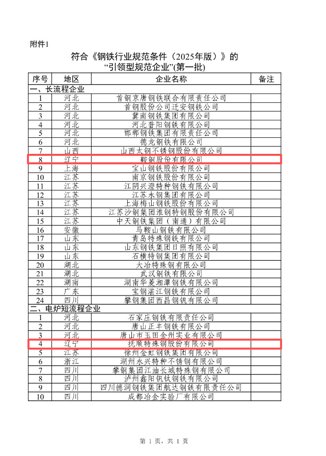 為推動(dòng)鋼鐵行業(yè)高質(zhì)量發(fā)展,依據(jù)《鋼鐵行業(yè)規(guī)范條件(2025年版)》(工業(yè)和信息化部公告2025年第1號(hào),以下簡(jiǎn)稱《規(guī)范條件》),經(jīng)地方初審、專家復(fù)審、網(wǎng)上公示等程序,現(xiàn)將符合《規(guī)范條件》的企業(yè)(第一批)予以公告。